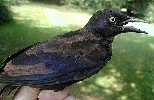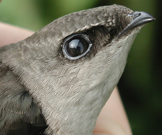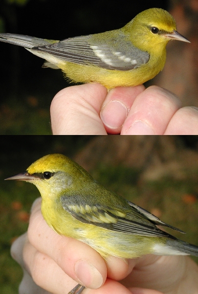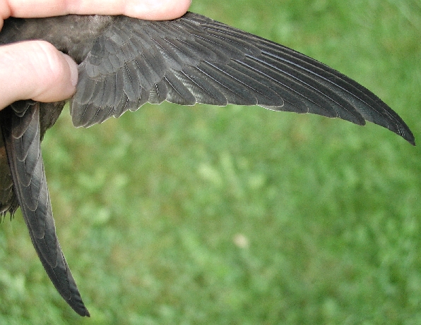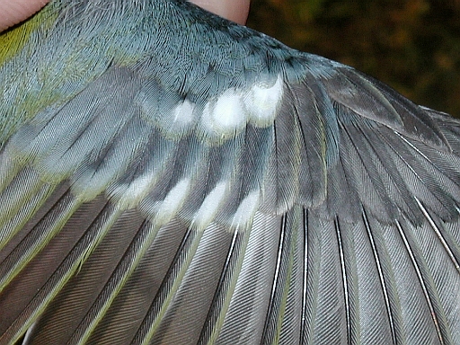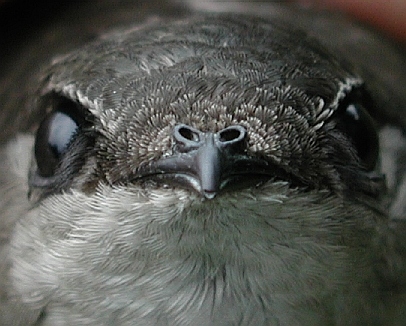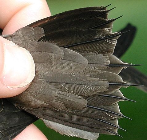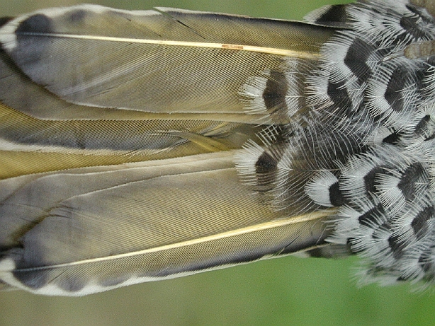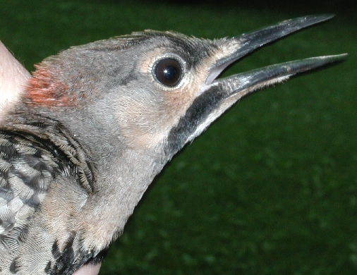 Despite its being in juvenal plumage, we sexed this bird as a male based on its reddish orange juvenal crown feathers and a black juvenal moustache. Because we don't band many flickers in juvenal plumage, we can't be sure, but a black juvenal moustache in male Northern Flickers may be unusual. Pyle (1997) in his Identification Guide to North American Birds, states that juvenile males "have a pale orange moustache (even in the Yellow-shafted Group, where the adult [males] have black moustaches). Thus, juvs can be reliably sexed by reddish-tinged moustaches and crowns."