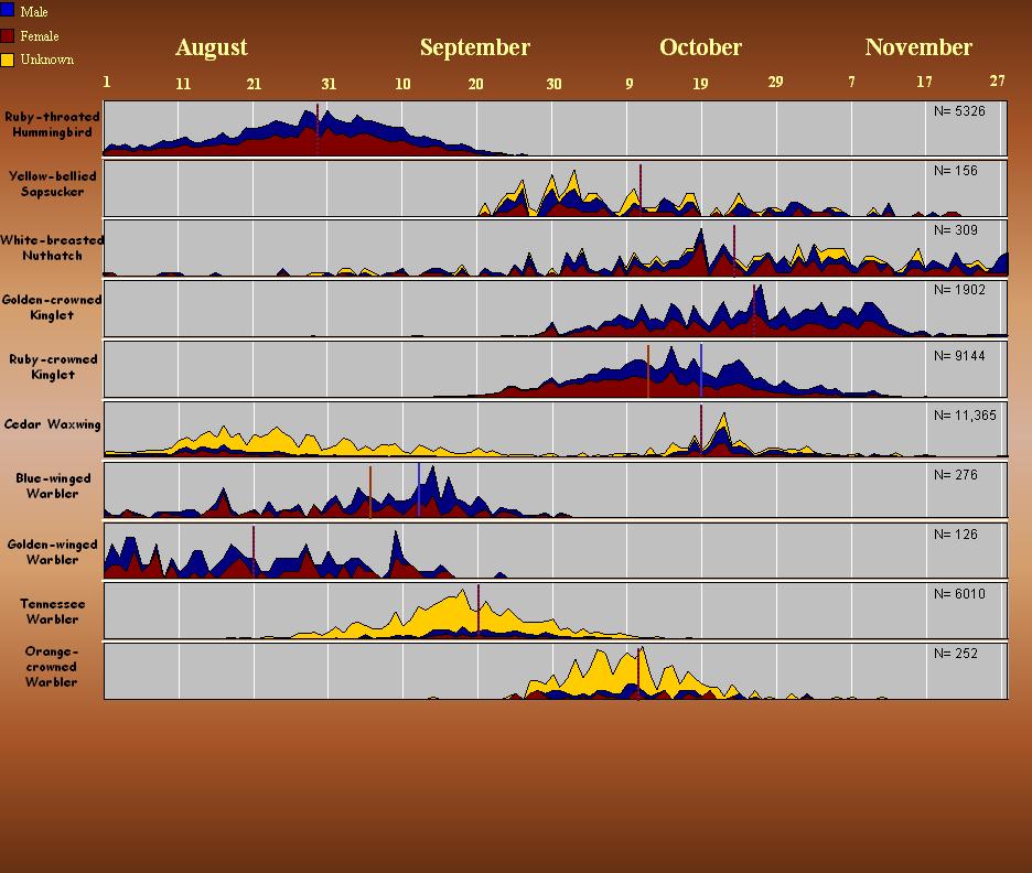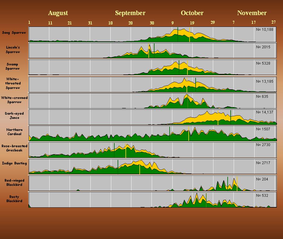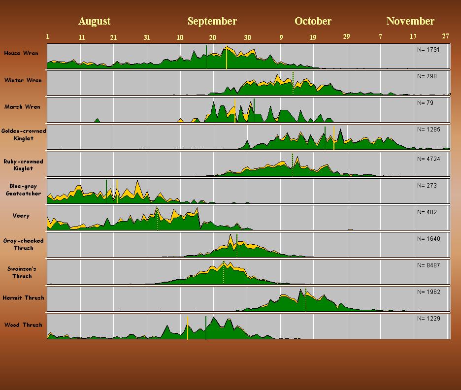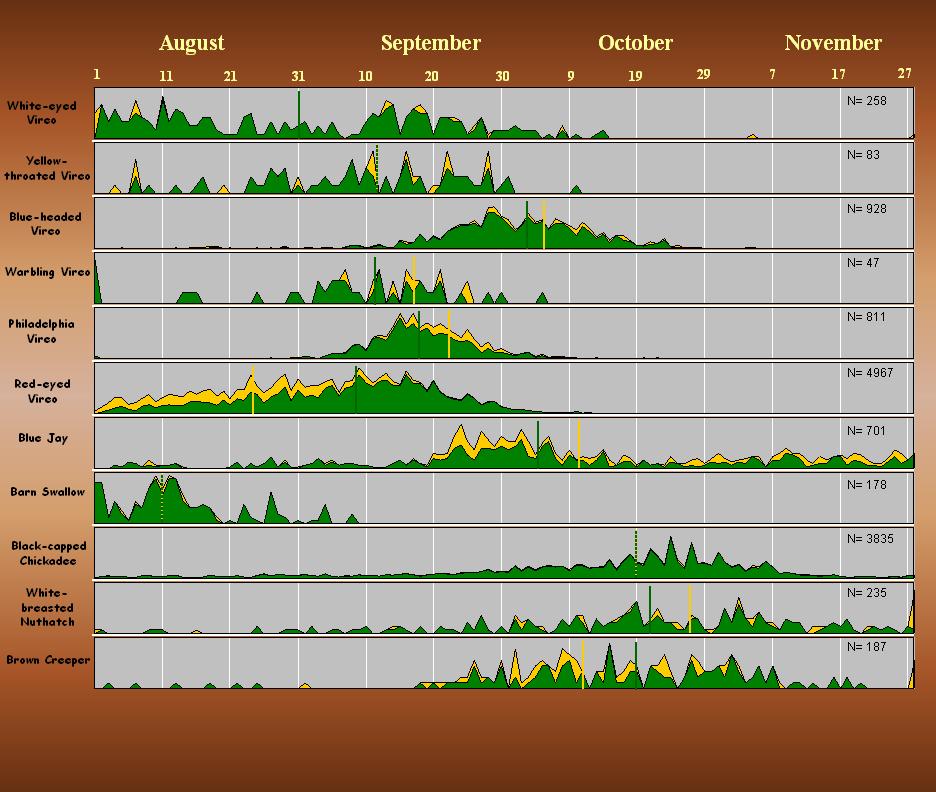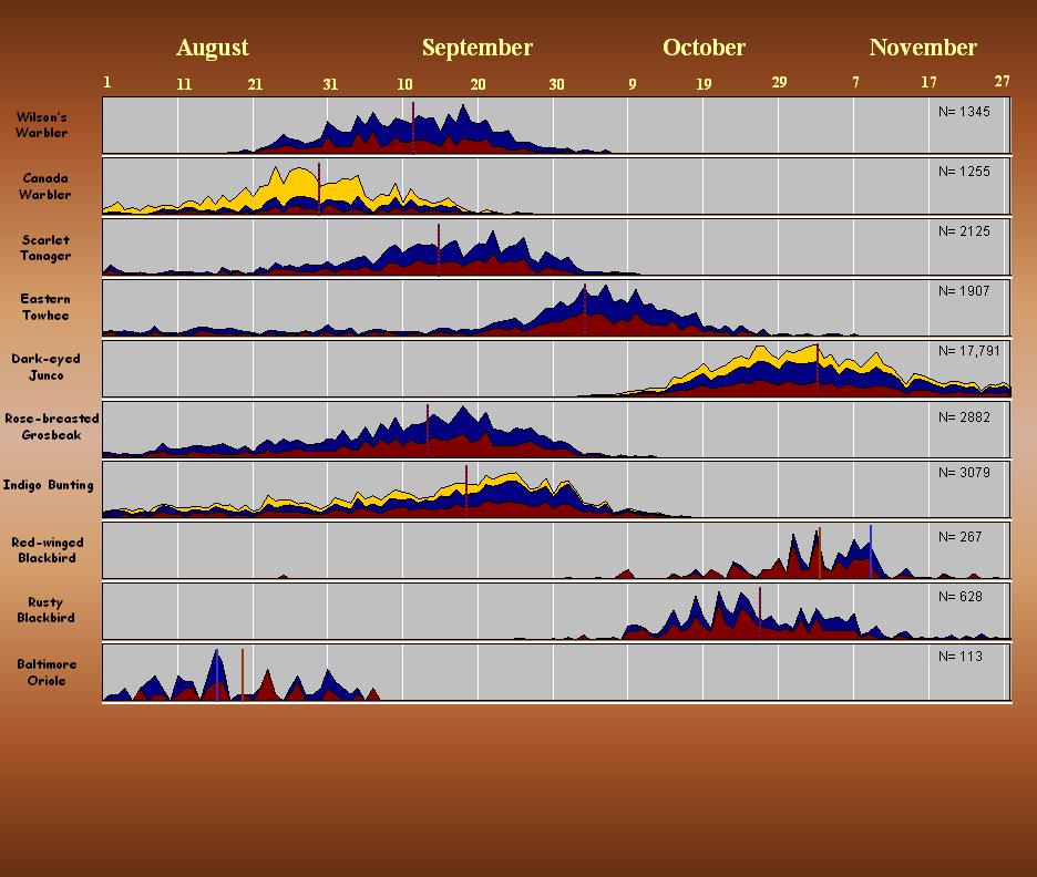 Powdermill fall migration data from 1962-2003. The first set of graphs