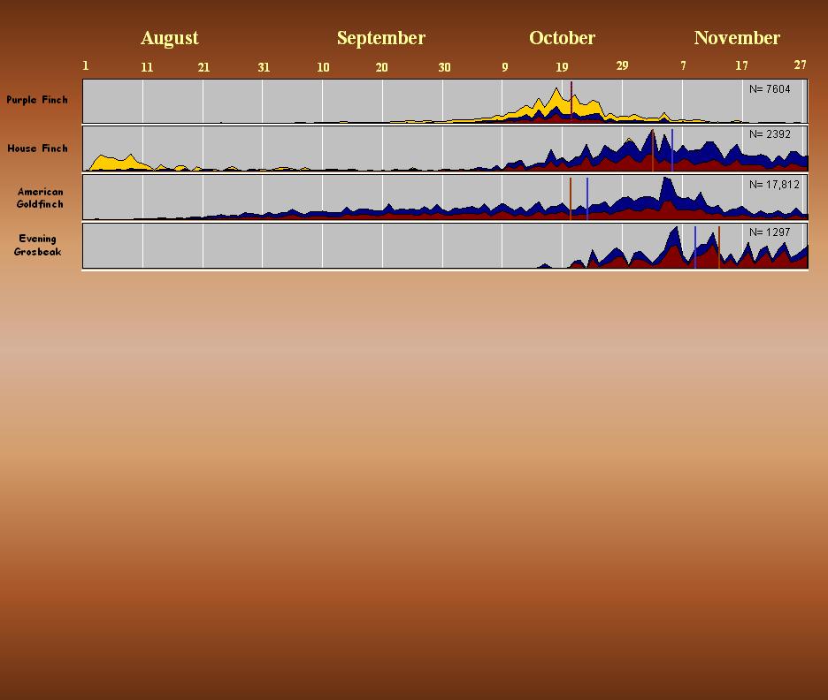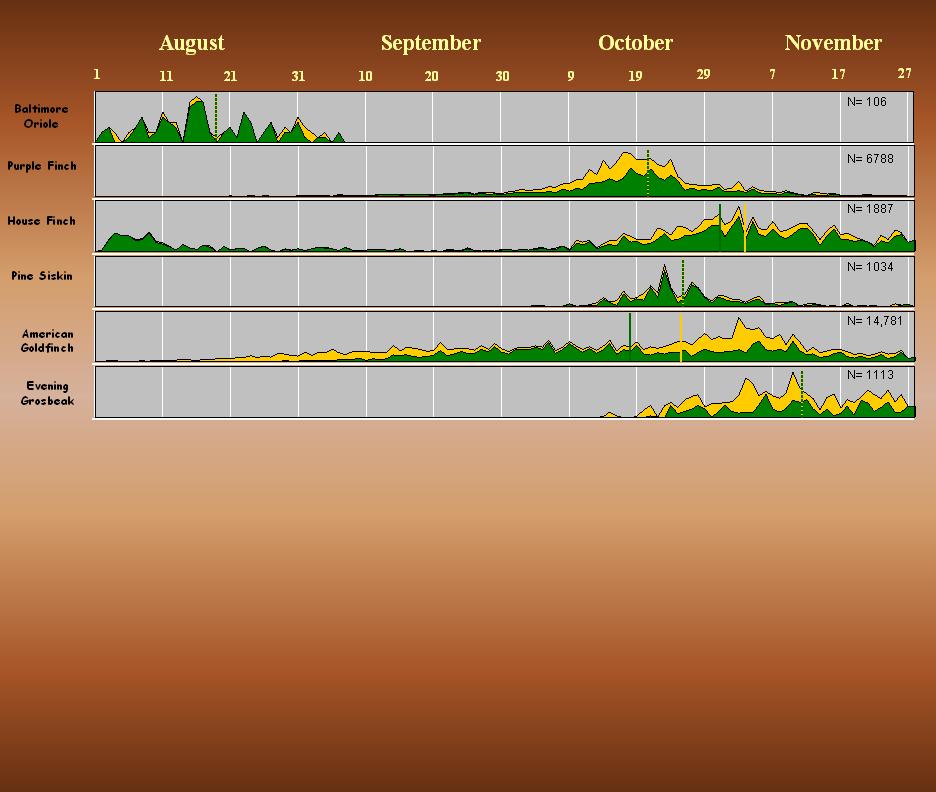 a few late migrant species, e.g. American Goldfinch and Am. Tree Sparrow,