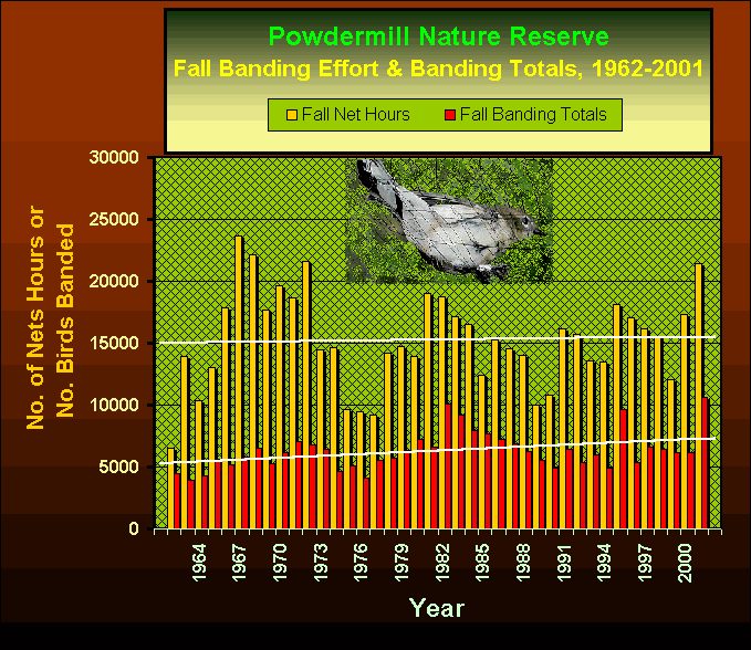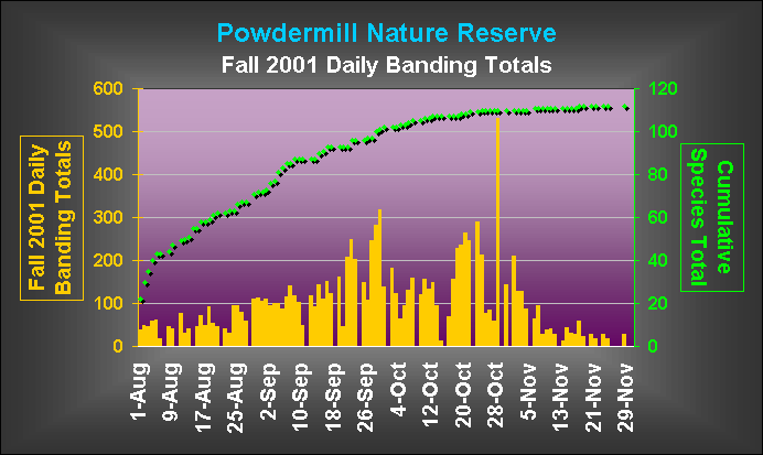 The bird-banding program at Powdermill Nature Reserve, the 2,000 acre biological stationof Carnegie Museum of Natural History located in the Laurel Highlands region of southwestern Pennsylvania, was in operation on 100 out of a possible 122 days during the fall 2001 season (August through November). Total banding effort for the season (21,640 net-hours) was the third highest ever, reflecting both favorable weather conditions for banding and more than the usual amount of assistance from enthusiastic and hard-working volunteers and interns. The result was a very interesting and productive banding season. For that reason we would like to begin by acknowledging everyone who helped this fall.