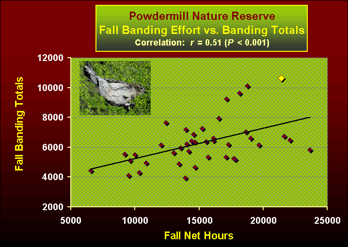 As we have said here before, apparent trends in our fall banding data, even when the data have been corrected for effort and subjected to rudimentary statistical analysis, must always be interpreted with caution. Simply put, when we assess trends in the number of birds of a given species caught during fall migration, we need to know what it is that we are measuring.