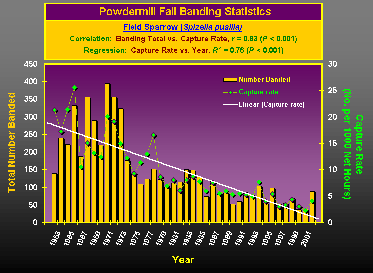In the links below (Species Totals Summaries), Powdermill banding totals (original captures only) from this fall are compared to averages, standard deviations, maxima, and minima for the previous 40 fall seasons (1962-2000). Similar statistics for each of the four component decades that the banding program has been in operation were published here previously (see Fall 2000 Summary). For selected species we have again graphed the annual fall totals from 1962-2001, and these are accessible through links in the summary table. In previous graphical summaries, however, we presented only raw data, uncorrected for effort, and without any statistical analyses. For this summary, we present both raw and effort-corrected data (note that in the species analyses, capture rates are expressed as birds per 1,000 net-hours, rather than birds per 100 net-hours, in order to give larger, more easily interpretable values). In general, correlations between fall banding totals and fall capture rates for individual species (ave. r = 0.88; range, 0.51-0.99) were much higher than the overall combined-species correlation (r = 0.34). We used simple linear regression statistics to provisionally examine these data for possible long-term trends in our fall capture rates for selected species (as examples, Hooded Warbler and Field Sparrow are shown below). Out of 82 species examined in this way, the majority (42) shows no significant linear trend, 14 have declining trends, and 26 increased significantly across years (click here for a list by trend category with links to charts).