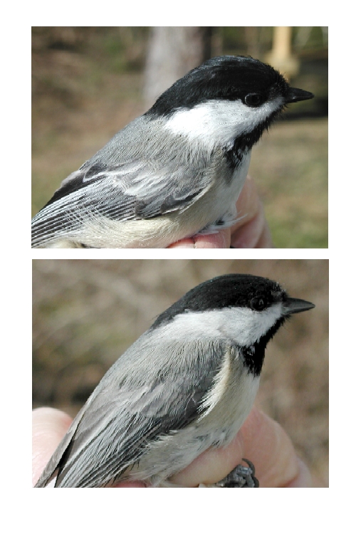 of a Black-capped Chickadee (top) and a Carolina Chickadee (bottom) that