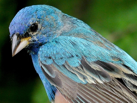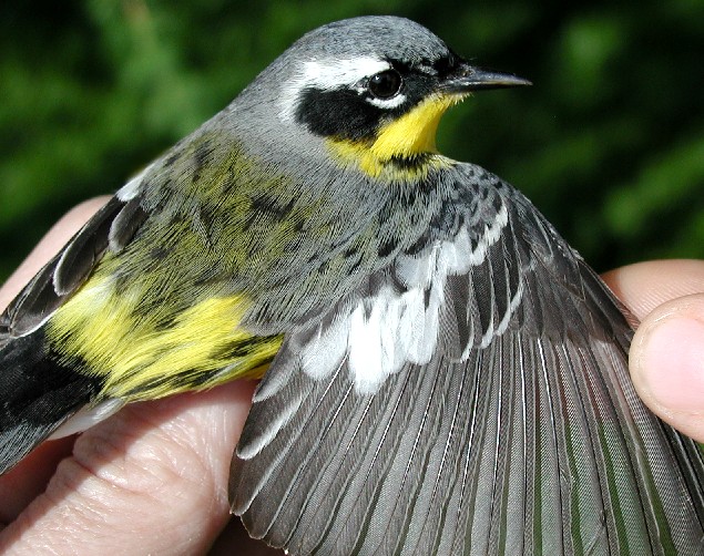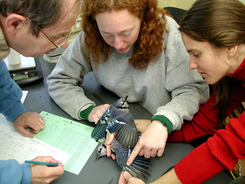 Early morning mist nets shimmered in the warm sun this past week, and although banding conditions were not ideal with it reaching near 80 degrees on multiple days, diversity continued to rise as we netted 18 new species for the spring. Our top species, once again, was Ruby-crowned Kinglet with 47 new birds being banded, all females (see discussion on differential migration of kinglets from Pictorial Highlights, April 20-25).Blue Jay came in second with 32 banded and in the photo below, Valeria Ojeda (far right), learns about Blue Jay molt and compares the differences between an adult (ASY; bottom bird) and immature (SY; top bird) with Powdermill bander, Adrienne Leppold, and Powdermill volunteer, Randi Gerrish. Valeria is an ornithologist from Argentina studying Magellanic Woodpecker breeding biology for her Ph.D., and she particulary enjoyed the summer-like weather that persisted much of the week during her visit, seeing as it is now becoming winter in her home in northwestern Patagonia.