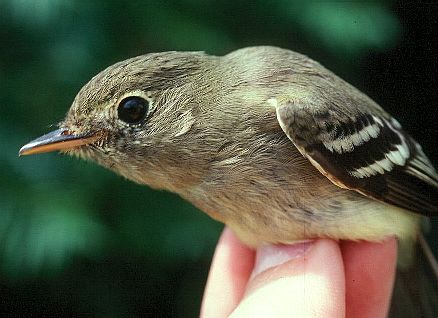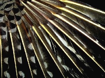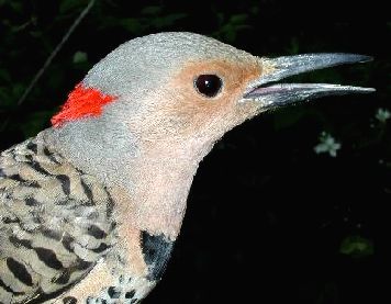 If you look closely, you will see that the shafts of the secondary wing feathers (the inner three long feather shafts) and the primary coverts (the short, unpatterned feathers above the primaries) are paler yellow than those of the primaries (the seven visible outer long flight feather shafts). These differences tell us that the bird molted its primaries (but not its primary coverts or secondaries) last fall, which, in turn, tells us that it is an SY (or second-year) flicker. Note, also, that one or two of the primary feather shafts has a pinkish cast, sometimes taken as an indication of intergradation with the western "Red-shafted" flicker form, but, in this case, more likely a diet-related plumage variation.