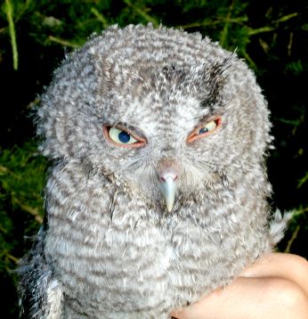 The banding this week continued to be dominated by large numbers of juvenile catbirds, phoebes, and Song Sparrows, as well as family groups of tanagers, thrushes, and redstarts from the surrounding forest. Some evening banding netted us our first Cliff Swallow in six years and a juvenile Eastern Screech Owl (below left). An unusual capture for us was a juvenile Dark-eyed Junco (below right). Juncos (of the southern Appalachian subspecies, Junco hyemalis carolinensis) nest at high elevations (>1800 ft.) near Powdermill, but are rarely encountered at lower elevations (the banding station is at 1300 ft.) before fall.
