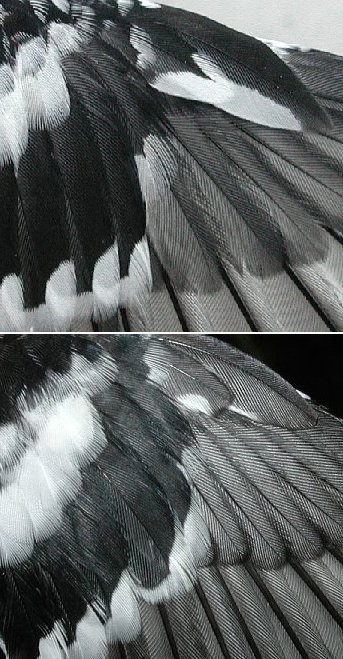 - Finally, in our notes for the last week of July we posted a picture of the wing coverts and alula of an immature Black-and-white Warbler and said that we would post a comparative photo showing the corresponding feather pattern of an adult at the earliest opportunity--that opportunity presented itself today. To restate the point made previously, the juvenal BAWW middle alula feather (bottom frame) always has just one or two white corner spots that do not meet at the tip of the feather, whereas the adult middle alula (upper frame) has a variable, but always continuous white terminal band. This is very helpful, because distinguishing between juvenal and the equivalent or adjacent adult feathers often is a matter of judging more subtle differences in color, lustre, shape, and wear.
