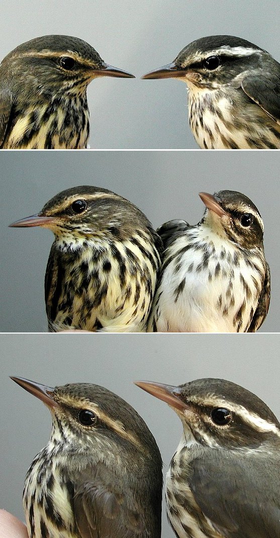 Although we have posted comparison photos of these two species before, we couldn't pass up the chance for another (and we think better than previous) side-by-side photo shoot of these two look-alike Seiurus species (NOWA on the left; LOWA on the right). Differences between the two species visible in the photo series below (several also noted previously) include yellower, more heavily streaked underparts in the NOWA; whiter (and wider) supercilium (eye stripe) and a whiter, more prominent subocular crescent (lower half of an eye ring) in the LOWA; a much more noticeably streaked chin in the NOWA; lastly, a much heavier (deeper at the base) bill in the LOWA.![]()