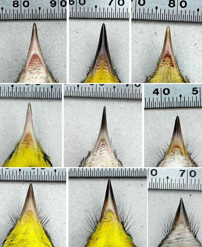 In the photo plate below the underside of the bills of nine species from eight genera banded this week are shown. From left to right, top row: Ovenbird (genus Seiurus), Kentucky Warbler (Oporornis), Common Yellowthroat (Geothlypis); middle row: Blue-winged Warbler (Vermivora), Black-and-white Warbler (Mniotilta), Chestnut-sided Warbler (Dendroica); bottom row: Canada Warbler (Wilsonia), Hooded Warbler (Wilsonia), American Redstart (Setophaga).