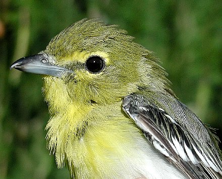 - Out of 37 species banded this week, ten were new for this fall's banding list, which now totals 44 species. Among these was Yellow-throated Vireo, an infrequently caught species at Powdermill that is easily "missed" during the fall banding season. On average we band only 1-2 YTVIs in the fall, because it is both a rather uncommon and comparatively high-ranging species (i.e., typically foraging in higher layers of vegetation above the height of our nets). The YTVI banded this week certainly was not a fall migrant, but rather a disheveled and heavily molting adult.