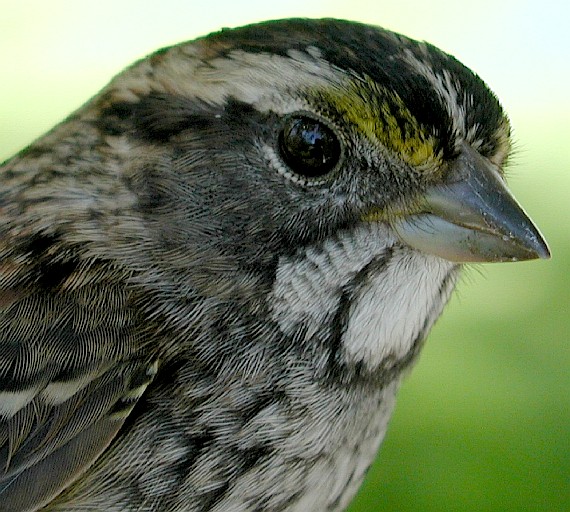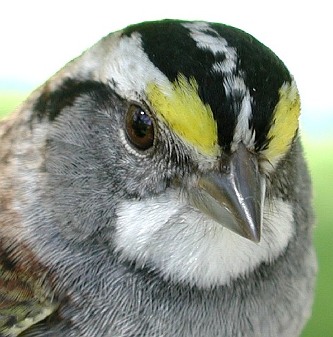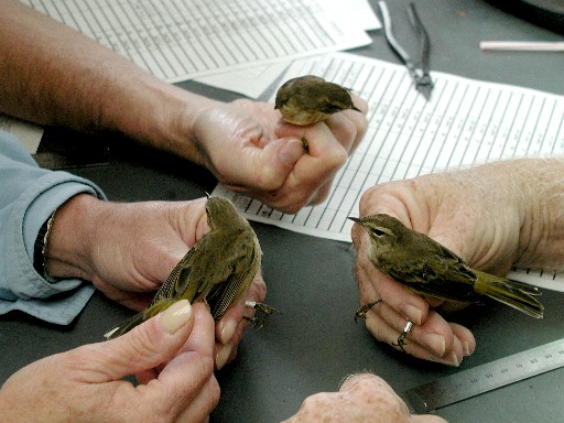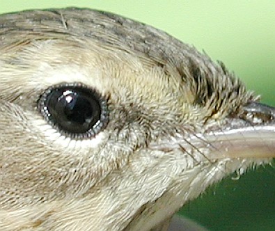 Even in generally brown-eyed species, like most sparrows and warblers, however, there usually is a subtle but discernable change in eye color as immature birds age. In general, if there is a difference in eye color between young birds and adults, adults typically have the richer, reddish brown eye color, while immatures will have a comparatively duller grayer eye color. Of course, excellent light is needed to see these subtle differences, and the word "comparatively" is key--a bander needs to observe lots of individuals of known age to see what constitutes a lighter gray-brown or darker reddish brown eye color for a given species, and the differences often are apparent only when two birds are compared side-by-side. For example, the redder brown eye color of the adult "Western" Palm Warbler pictured below left, compared to the grayer brown eye color of a HY PAWA in the photo on the right.