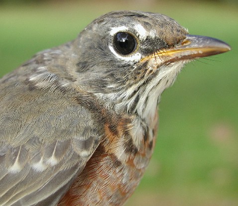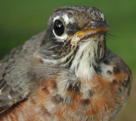 Robin with a surprising amount of retained juvenal plumage. Its wing