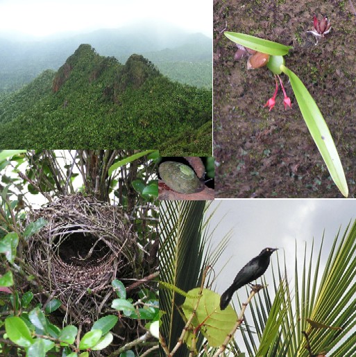 to right, shows: a rock outcrop on El Yunque peak in the rainforest, orchid