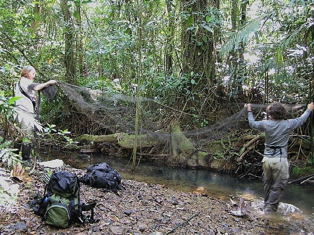 Adrienne and Mike setting up a mist net to catch a Louisiana Waterthrush