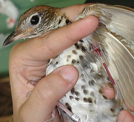 Recent studies have shown negative impacts from heavy acid rainfalls on the success of numerous breeding birds, possibly due to calcium depletion (i.e., leaching) of the environment. Acid rain also tends to add sulfates to the soil which is known to increase MeHg production in wetlands, but new evidence has shown that there is also a relationship between high levels of MeHg in upland forests with acidic soils. Because negative effects of Hg on aquatic ecosystems is well documented, there is reason to believe the same Hg deposition could be having negative effects on forest ecosystems as well. As MeHg builds up in the soil and leaf litter of forest floors, it is absorbed by invertebrates. Higher vertebrates, namely forest bird species that feed heavily on the invertebrates containing high levels of MeHg, will likely suffer negative effects (e.g., behavioral changes inconsistent with successful breeding). In an effort to understand the possible links between environmental stressors, in this case MeHg, and neotropical migrant songbirds within their breeding range, the Biodiversity Research Institute is working to develop an exposure profile to MeHG for breeding birds in NY and PA.