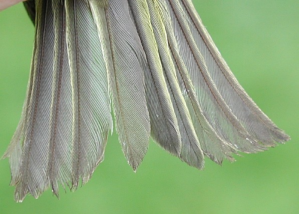 the fresher appearing rectrices 1 & 2 on the right half of her tail