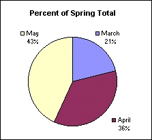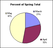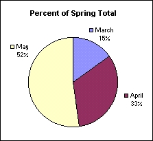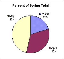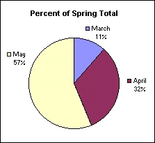 As another way of looking at the spring 2001 Powdermill banding season, when our spring banding totals were broken down taxonomically, the percent contribution for "Sparrows," which includes juncos, was much smaller than usual in spring 2001 (see pie charts). Another pattern evident in these taxonomic pie charts is the much higher percent contribution of "Northern Finches" in the 1970s (Evening Grosbeaks) and 1980s (Pine Siskins), spring flights of which all but disappeared in the most recent decade.