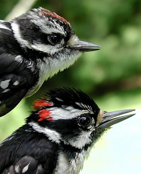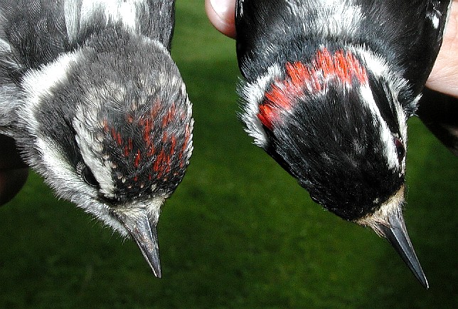 and adult male Downy Woodpeckers pictured below both have red head feathers.