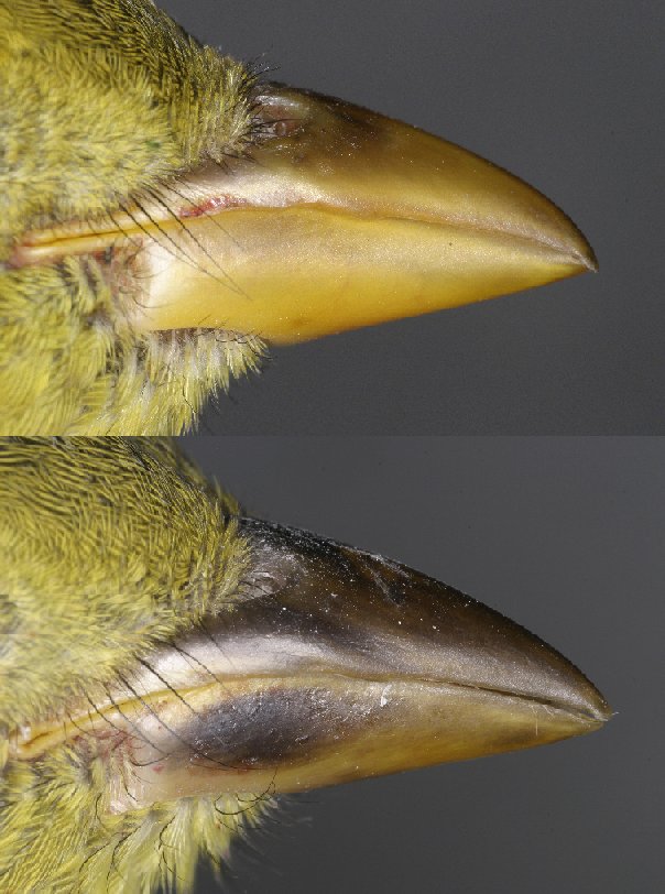 we removed it from the net, the top bird's light yellow-orange bill, as