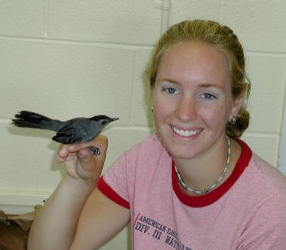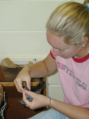 Back at the lab, Annie did the honors of placing band #8108-34671 on the catbird and passed it on to Bob L. for processing.