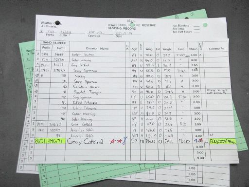 The catbird was placed, ceremoniously, of course, into a paper bag, and, after checking the remainder of our nets, we headed back to the lab to make the 500,000th banding record official.