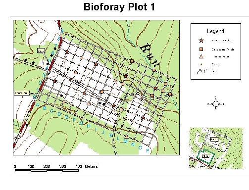 Of particular interest to visitors of this website might be results of the bird sampling component. A total of 47 point counts was done throughout both plots (four runs at eight points on Plot 1; three runs at five points on Plot 2) on two mornings and intensive territory survey mapping was done on Plot 1. The results of the territory mapping have not yet been fully analyzed but there were 120 confirmations of territories for breeding birds on Plot 1 (territories were confirmed when a nest was found or fledglings were seen near a nest site). A couple noteworthy highlights from the territory mapping this year were the finding of three Golden-winged Warbler nests, two with recently fledged young, and a Grasshopper Sparrow nest on Plot 1. Five-minute point counts (number of birds of each species recorded inside and outside 50 m) were done at all primary plot points (denoted by stars in the map above). The table below gives the average total number (inside and outside 50m) of birds of each species detected at each point as a relative index of abundance for quick comparison across plots. 57 species were detected on both plots combined (53 on Plot 1 and 34 on Plot 2). Comparing across plots, the difference in habitat between Plots 1 and 2 is reflected in the point count results. All but one primary sampling point for Plot 2 was in field or old field habitat while Plot 2 was much more diverse and included field, old field edge, riparian, and woodland points. Red-eyed Vireo, a very common forest nesting songbird, was well represented in the point counts on Plot 1 and was, not surprisingly, the most abundant bird in Plot 1. Song Sparrow, however, a very common bird of old field habitats, was the most abundant bird in Plot 2. Eastern Meadowlark was only found on Plot 2, which has the most extensive tract of open grassland habitat, while forest nesting species such as the Hooded Warbler and Winter Wren, were only found on Plot 1. Again, the overall much higher species richness on Plot 1 reflects the greater diversity of habitats sampled there. While species abundance between the two plots was different, the plots were very similar in species composition. The top ten for both plots are dominated by, not surprisingly, birds characteristic of old field habitats such as Song Sparrow, Indigo Bunting, and American Goldfinch. Point count observers were Mike Lanzone, Robert Mulvihill, Miriam Sharick, Adrienne Leppold, and Jeanine Tardiff. The background image is a view of part of the field on Plot 1. <click here> to read about last year's Bioforay |