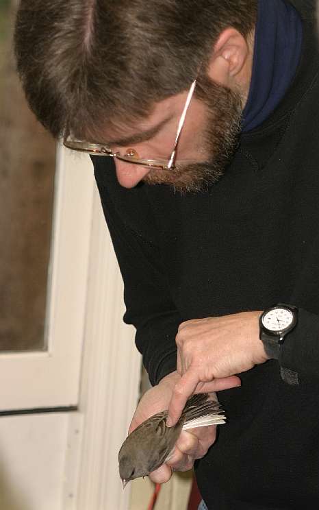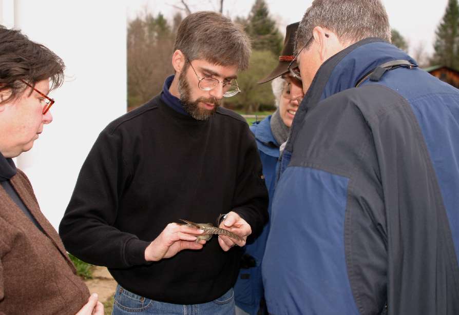 Bob Mulvihill, Lukas Jenni and others examining molt patterns of an