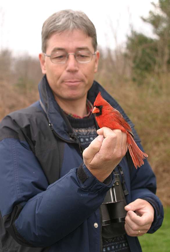 Visiting British ringer, David Norman (left), with Bird Banding Lab biologist, Mary Gustafson, examining wing molt limits on an Eastern Phoebe.