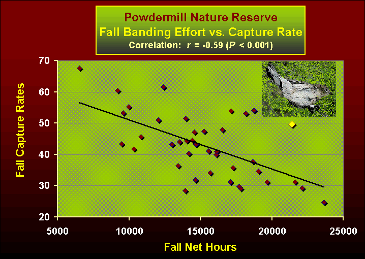 As we have said here before, apparent trends in our fall banding data, even when the data have been corrected for effort and subjected to rudimentary statistical analysis, must always be interpreted with caution. Simply put, when we assess trends in the number of birds of a given species caught during fall migration, we need to know what it is that we are measuring.