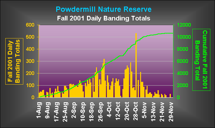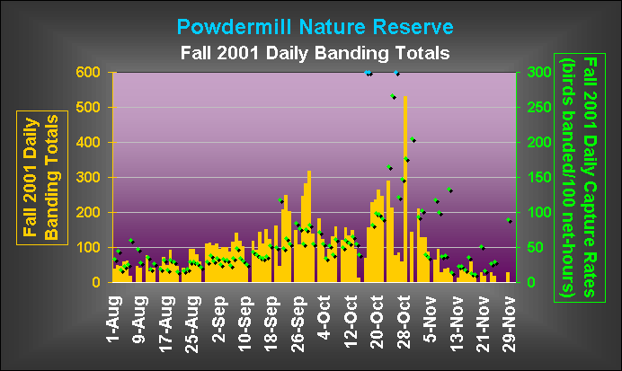 The bird-banding program at Powdermill Nature Reserve, the 2,000 acre biological stationof Carnegie Museum of Natural History located in the Laurel Highlands region of southwestern Pennsylvania, was in operation on 100 out of a possible 122 days during the fall 2001 season (August through November). Total banding effort for the season (21,640 net-hours) was the third highest ever, reflecting both favorable weather conditions for banding and more than the usual amount of assistance from enthusiastic and hard-working volunteers and interns. The result was a very interesting and productive banding season. For that reason we would like to begin by acknowledging everyone who helped this fall.