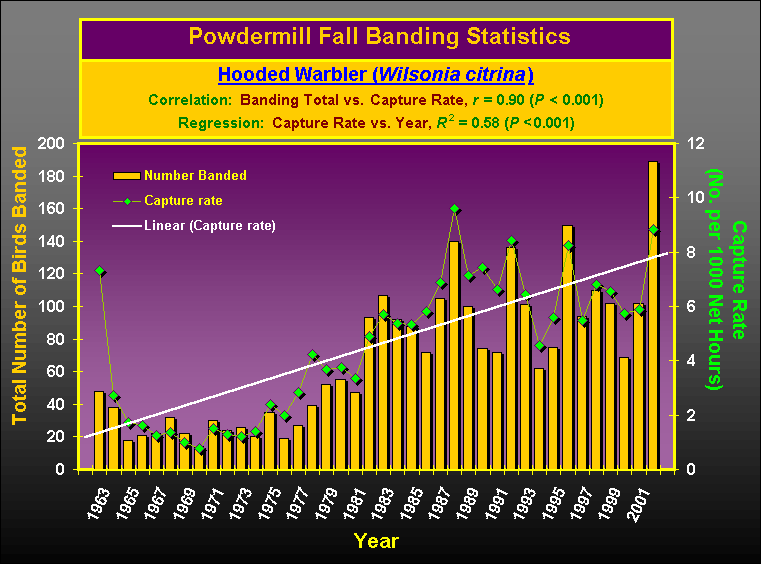 In the links below (Species Totals Summaries), Powdermill banding totals (original captures only) from this fall are compared to averages, standard deviations, maxima, and minima for the previous 40 fall seasons (1962-2000). Similar statistics for each of the four component decades that the banding program has been in operation were published here previously (see Fall 2000 Summary). For selected species we have again graphed the annual fall totals from 1962-2001, and these are accessible through links in the summary table. In previous graphical summaries, however, we presented only raw data, uncorrected for effort, and without any statistical analyses. For this summary, we present both raw and effort-corrected data (note that in the species analyses, capture rates are expressed as birds per 1,000 net-hours, rather than birds per 100 net-hours, in order to give larger, more easily interpretable values). In general, correlations between fall banding totals and fall capture rates for individual species (ave. r = 0.88; range, 0.51-0.99) were much higher than the overall combined-species correlation (r = 0.34). We used simple linear regression statistics to provisionally examine these data for possible long-term trends in our fall capture rates for selected species (as examples, Hooded Warbler and Field Sparrow are shown below). Out of 82 species examined in this way, the majority (42) shows no significant linear trend, 14 have declining trends, and 26 increased significantly across years (click here for a list by trend category with links to charts).